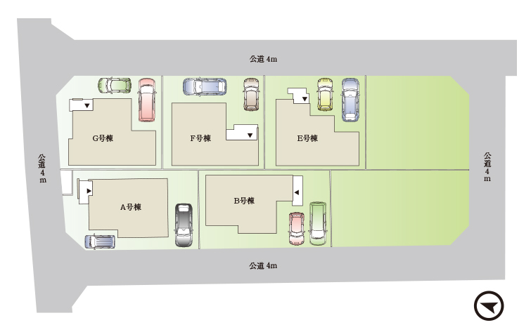 | 敷地面積 | A号棟:128.23㎡(約38.78坪) B号棟:128.36㎡(約38.82坪) E号棟:120.29㎡(約36.38坪) F号棟:120.28㎡(約36.38坪) G号棟:120.29㎡(約36.38坪) |